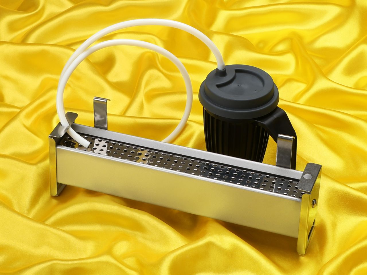 Größe: 28×5,3×8cm (ca. 10cm mit Haken), Gewicht: ca. 1.650g (abweichend je nach Füllung), Außenmaterial: Edelstahl, Füllmaterial: Steine, Becher: Kunststoff (Biopolymer aus nachwachsenden Rohstoffen), Deckel: TPE, Schlauch: hitzebeständiges Silikon, Hinweis: Nicht für Pyrolyse Funktion geeignet