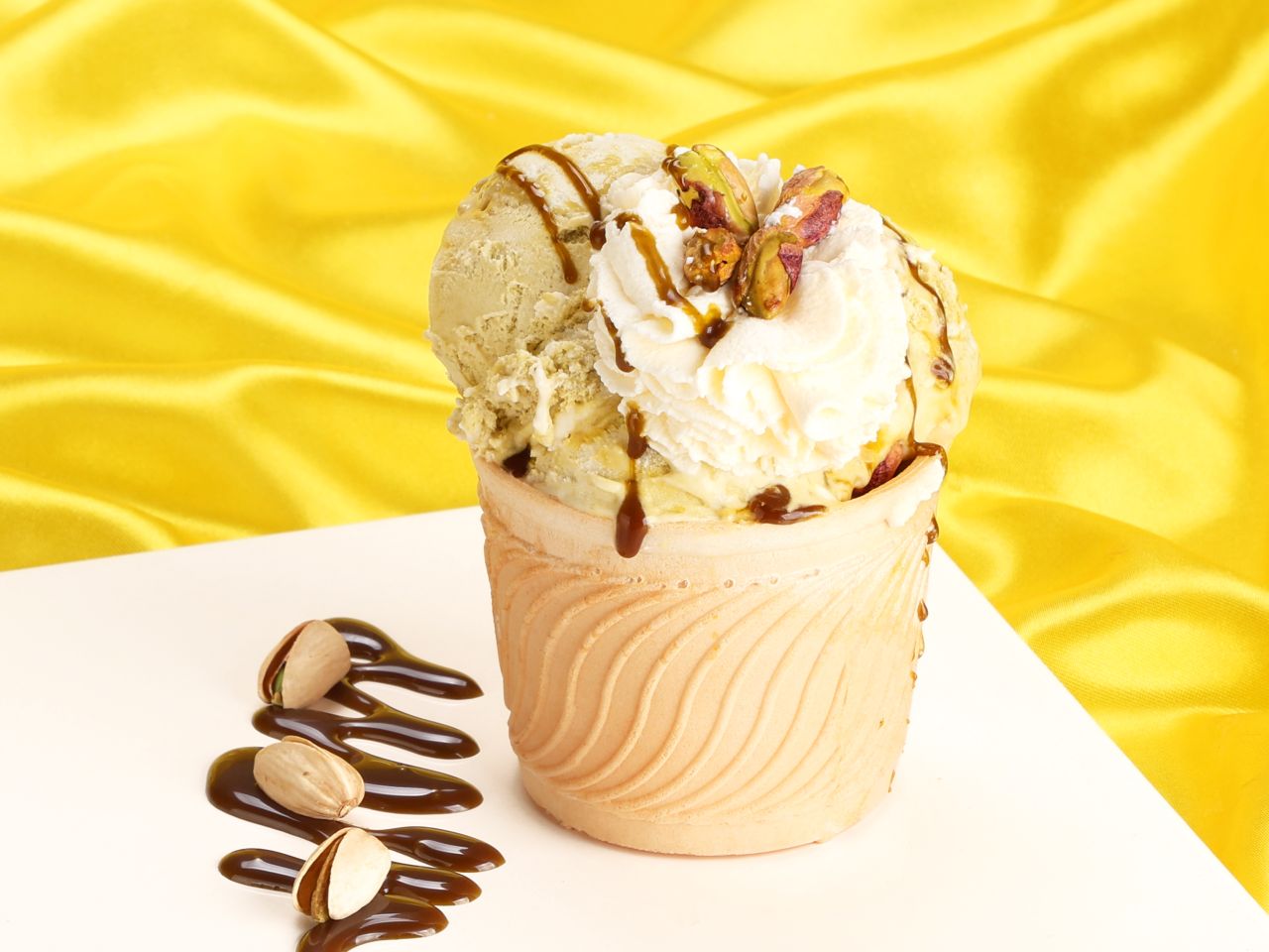 Glucosesirup, PISTAZIEN (7 %), MANDELN (6 %), Aroma, färbendes Spirulina-Mikroalgenkonzentrat, Farbstoff: Curcumin.Haltbarkeit: