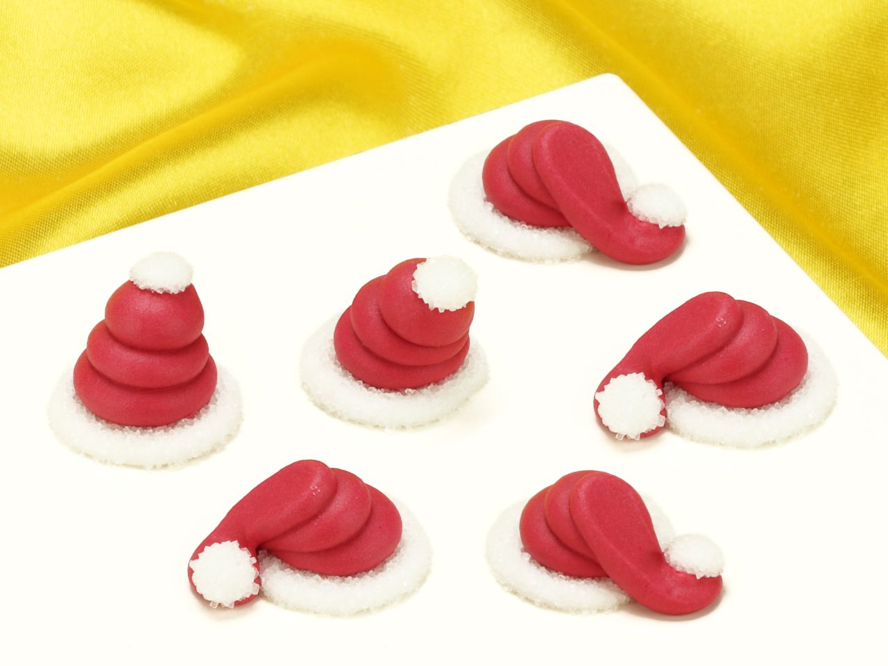 Father Christmas caps made of fine sugar. You will receive 6 pieces in a set. Use them to decorate Christmas pastries and much more.