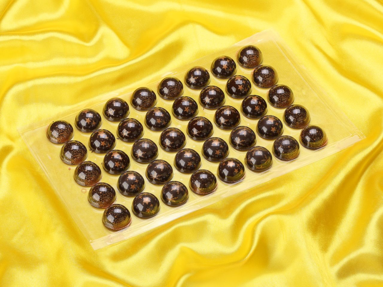 Hemispheres with elaborate printing. You will receive 40 pieces on a foil. Simply fill and use as hemisphere decorations or combine two hemispheres to make a praline.
