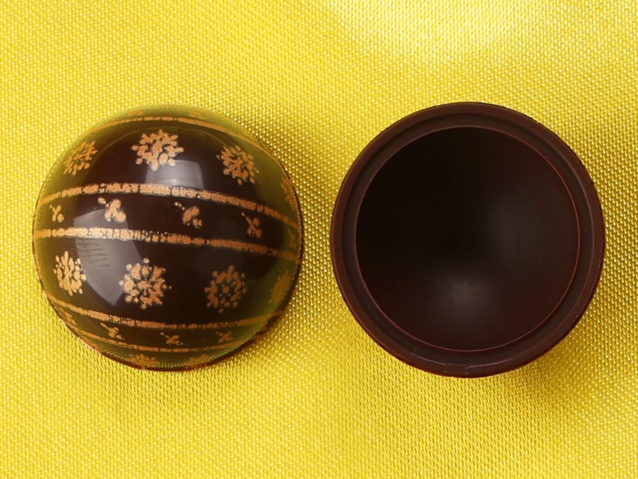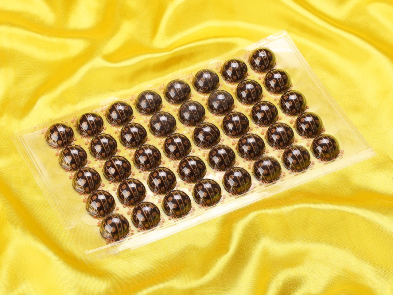 Hemispheres with elaborate printing. You will receive 40 pieces on a foil. Simply fill and use as hemisphere decorations or combine two hemispheres to make a praline.