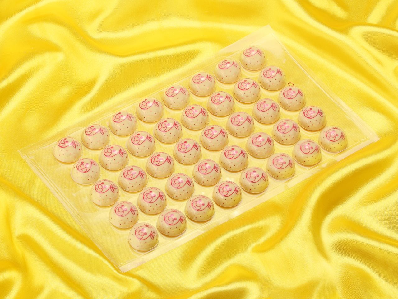 Hemispheres with elaborate printing. You will receive 40 pieces on a foil. Simply fill and use as hemisphere decorations or combine two hemispheres to make a praline.