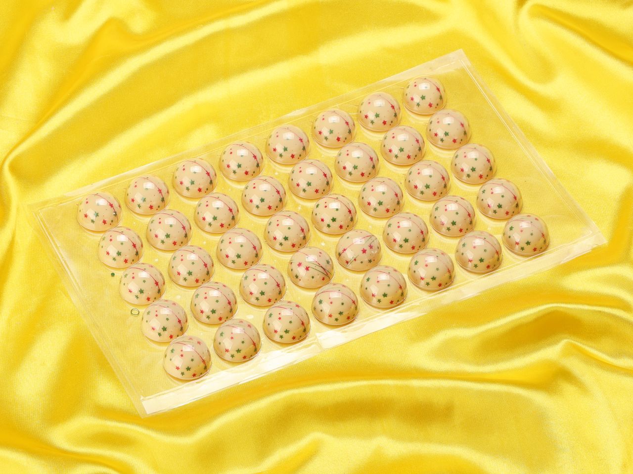Hemispheres with elaborate printing. You will receive 40 pieces on a foil. Simply fill and use as hemisphere decorations or combine two hemispheres to make a praline.