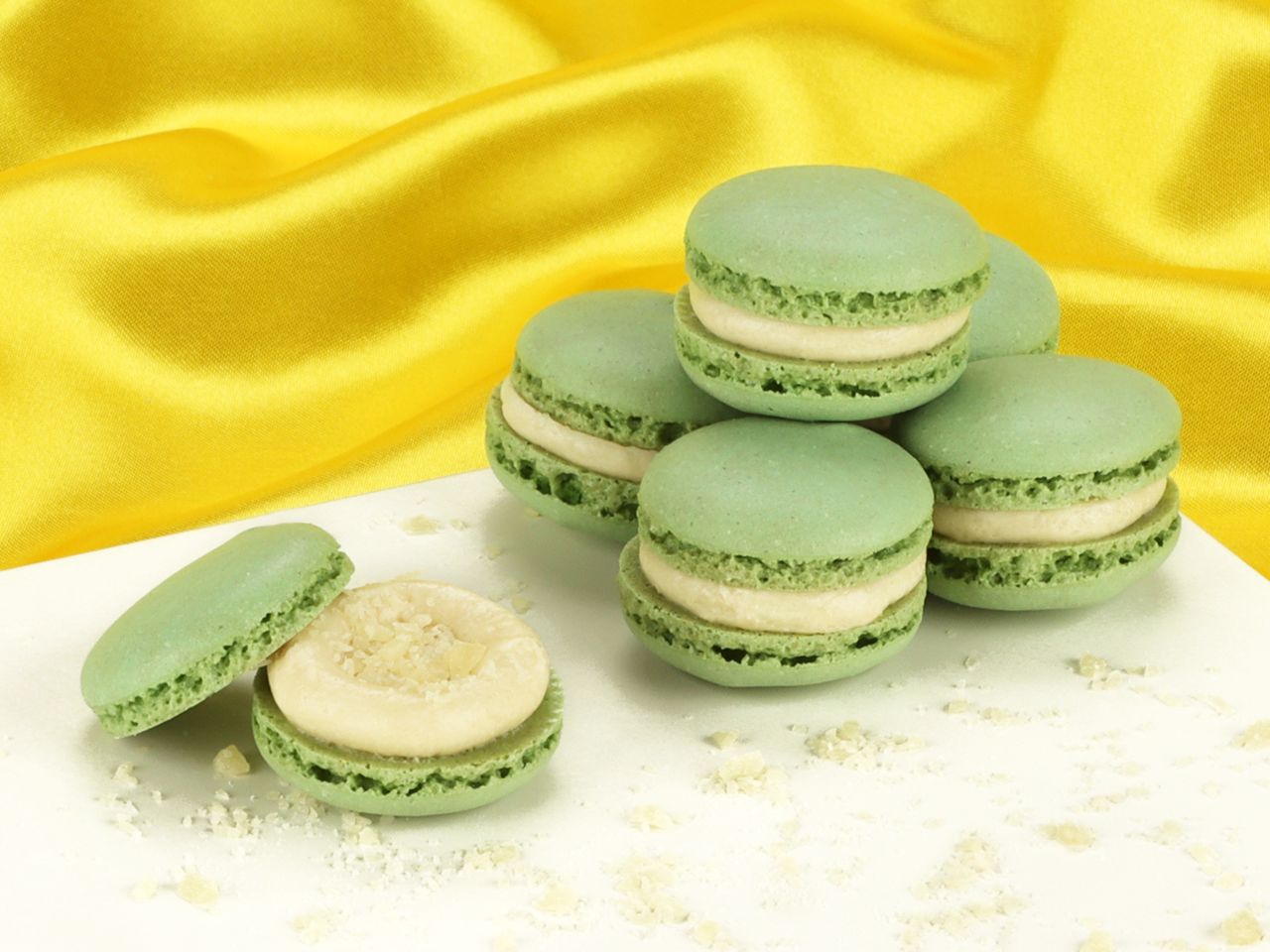 384 ready-baked Macaron half-shells for 192 Macarons to fill yourself. You will get each 96pcs. in champagne, green, red and brown. The Macaron shells are made from fresh almond flour and egg white. Fill these half-shells to your heart's content with creams or fruit mixes.