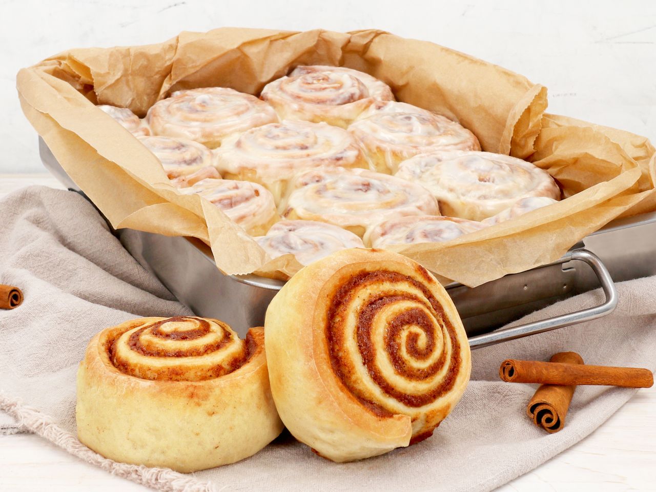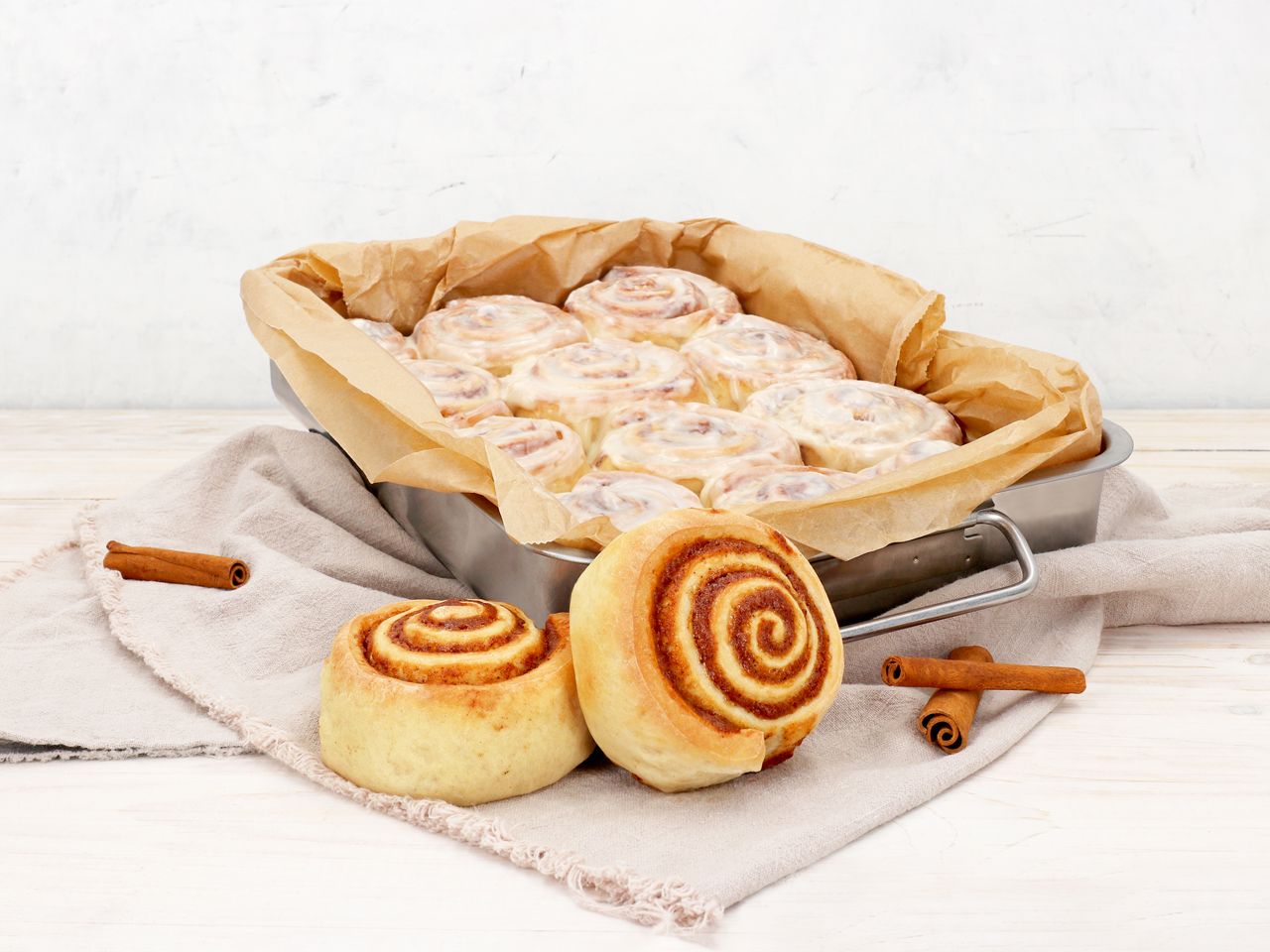 After the resting time, roll out the dough into a rectangle (approx. 45cm x 25cm) and spread thinly with the Remonce cinnamon filling. Then cut the rectangle into strips approx. 3.5cm in size. Roll up the strips of dough lengthways and place in a greased baking dish (approx. 30x20cm). Cover and leave to rise for approx. 60 minutes until the cinnamon rolls have noticeably increased in volume.