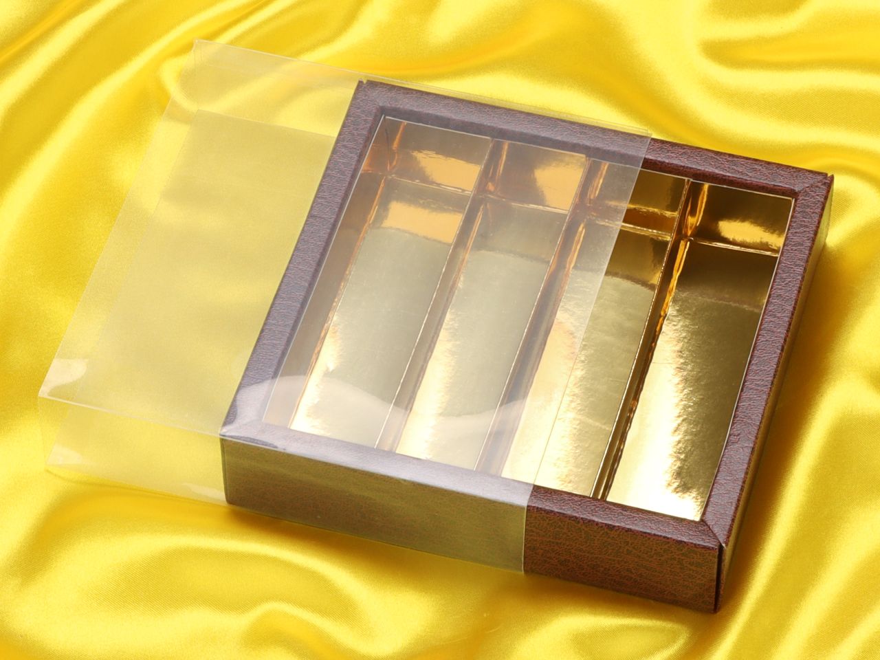 Eine sehr schöne, hochwertige Verpackung in die leicht 16 Pralinen passen. Der Kunststoffschieber ist noch mit einer Folie überzogen, die man abziehen muss, damit es richtig klar wird.
