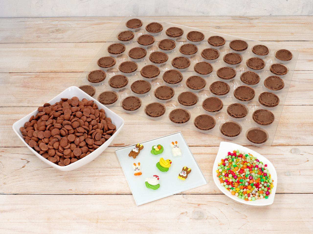 Für die Dekoration 50g Vollmilch Callets temperieren und mit einem Teelöffel oder einer Spritztüte feine Linien auf die Hälfte der Macaron-Schalen ziehen. Mit Sprinkles und Zuckerfiguren dekorieren, solange die Schokolade noch feucht ist.