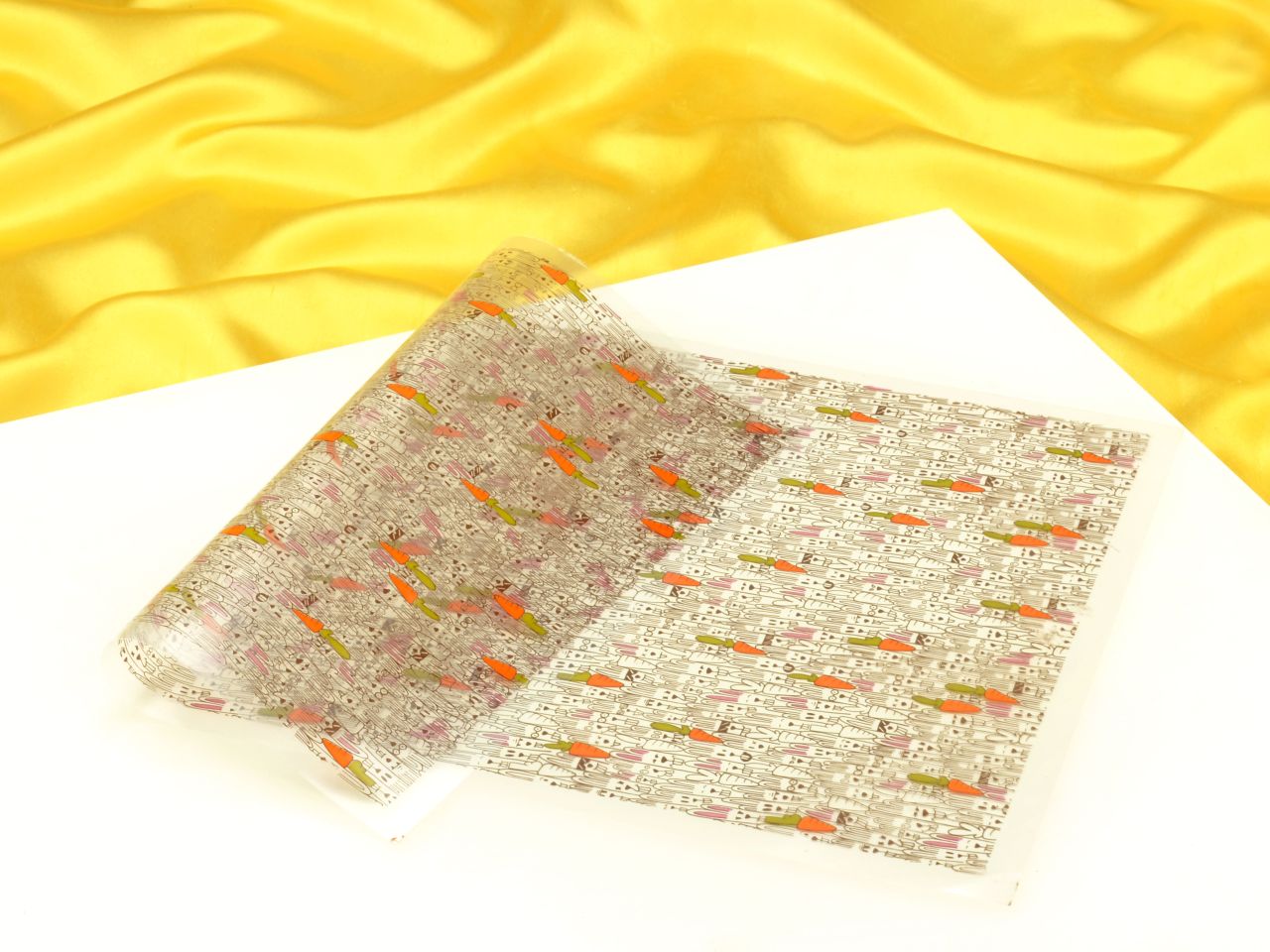 Insert cakes or desserts inverted in the Sheet. Strip the Sheet off after freezing. The decorations are now transferred to the cake or dessert.