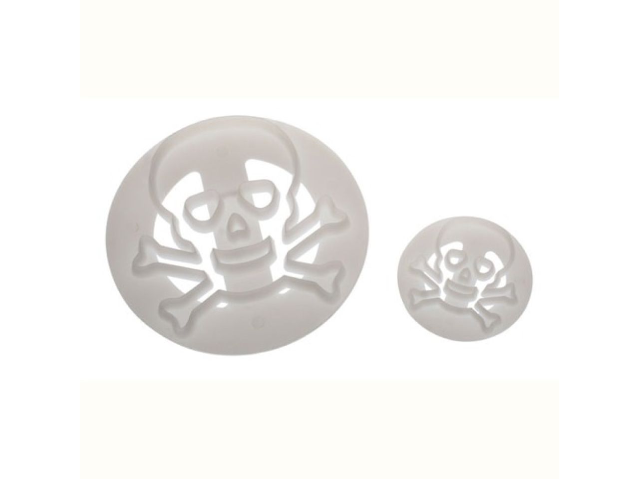 Schaurig-schöne Ausstecher "Totenkopf" für Fondant und Blütenpaste von FMM Sugarcraft. Sie möchten eine Torte oder Cupcakes für eine Piratenparty kreieren? Dann ist das Set mit zwei Fondantausstechern perfekt für Sie. Natürlich eignet sich das Ausstecher-Set von FMM Sugarcraft auch ganz ausgezeichnet, um Verzierungen für Torten und Cupcakes an Halloween zu zaubern. Mit den beiden Ausstechformen gelingen Ihnen im Handumdrehen Totenköpfe aus Fondant oder Blütenpaste in zwei verschiedenen Größen.