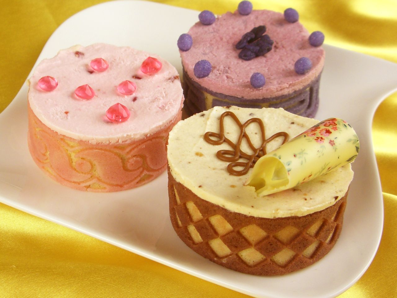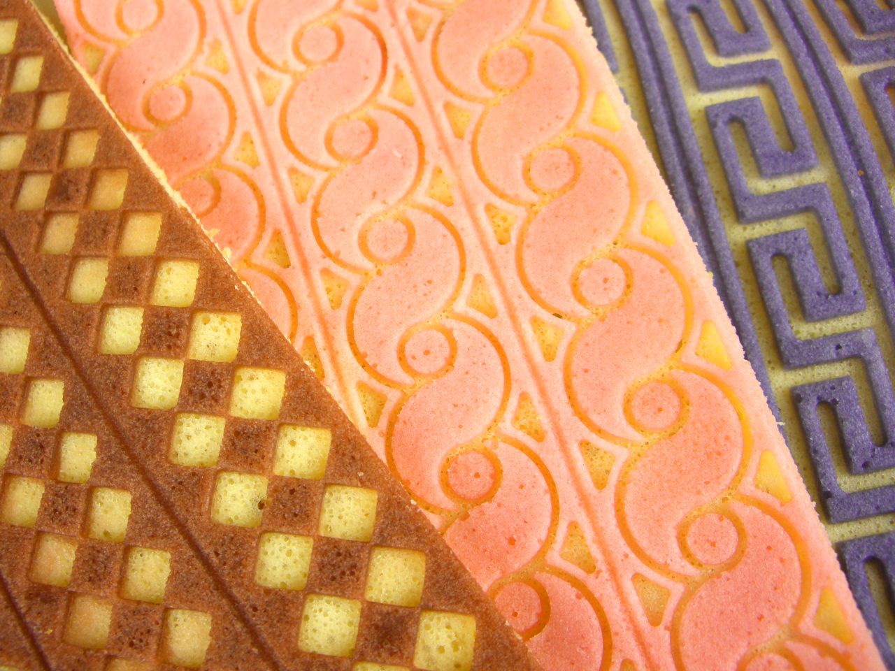 Relief-Backmatte zur Herstellung von strukturierten und mehrfarbigen Biskuit-Kapseln. Es werden zwei verschiedene Massen auf die Backmatte gegeben. So entsteht nach dem Backen eine strukturierte, mehrfarbige Oberfläche. Auch zum Strukturieren von Einschlagmasse oder Marzipan verwendbar.