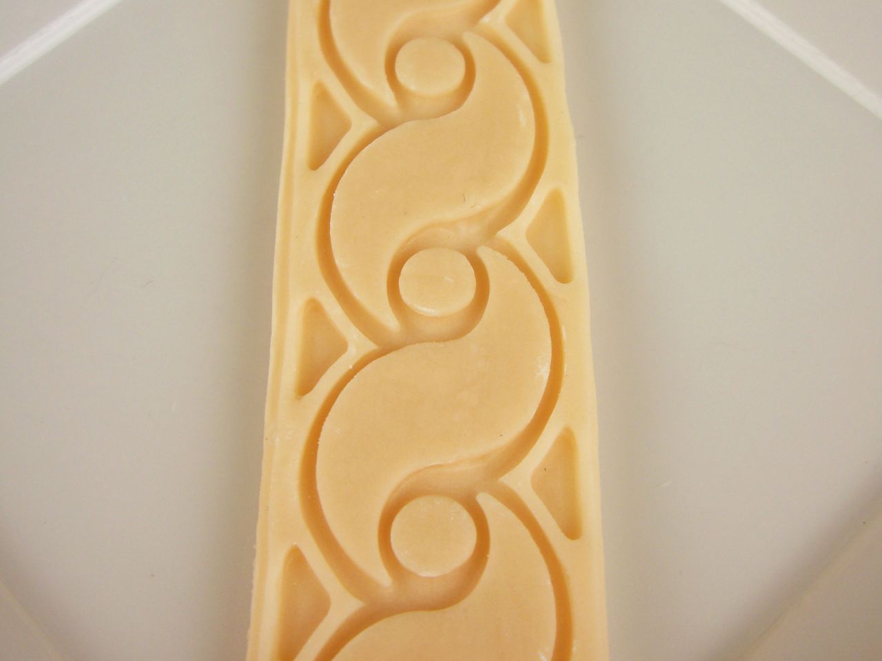 Relief-Backmatte zur Herstellung von strukturierten und mehrfarbigen Biskuit-Kapseln. Es werden zwei verschiedene Massen auf die Backmatte gegeben. So entsteht nach dem Backen eine strukturierte, mehrfarbige Oberfläche. Auch zum Strukturieren von Einschlagmasse oder Marzipan verwendbar.