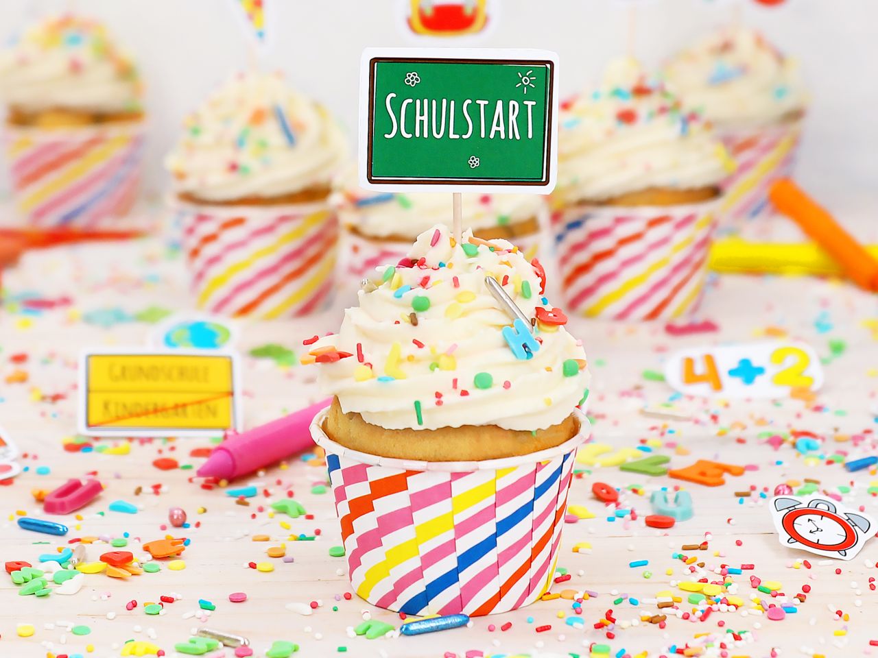 Den Backofen auf 200°C Ober-/Unterhitze vorheizen. Die Backmischung zusammen mit den Eiern, dem Speiseöl und dem Wasser in eine Rührschüssel geben und zunächst kurz auf niedrigster Stufe verrühren, dann auf höchster Stufe 3 Minuten glatt rühren. Für Schokomuffins geben Sie zusätzlich 60g Schokotropfen hinzu. Die Masse gleichmäßig in geeignete Backformen verteilen. Wir empfehlen, Muffinkapseln in ein Muffinbackblech zu setzen oder eine Silikonform zu nutzen. Anschließend mit den übrigen Schokostückchen dekorieren. Backen Sie den Teig auf der mittleren Ebene für ca. 15 - 20 Minuten und lassen die Muffins anschließend auskühlen. Danach können Sie die Muffins vernaschen oder sie nach dem Abkühlen zunächst kreativ dekorieren. Wenn Sie ein paar Anregungen benötigen, empfehlen wir unsere Videoanleitung zum Thema Cupcakes dekorieren.