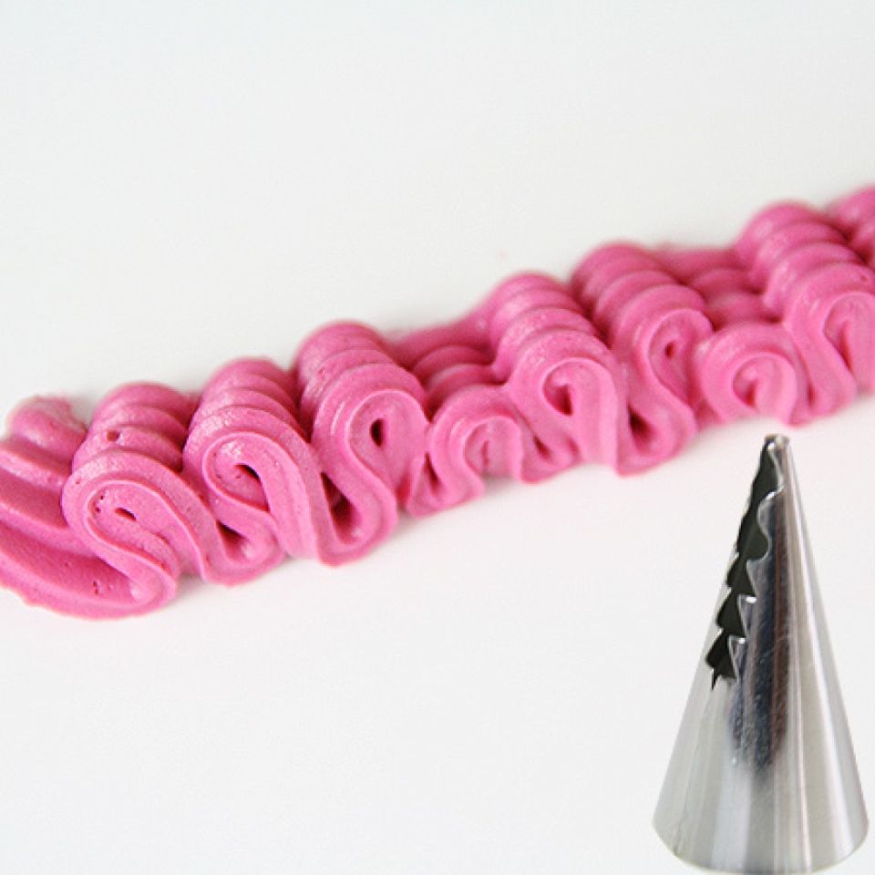 Hochwertige Spritztülle aus Edelstahl von Decora. Die Rüschentülle ist hervorragend geeignet, um gewellte Tortendekorationen aus Buttercreme zu kreieren. Bereichern Sie Ihre Auswahl an Spritztüllen für die Tortendeko um eine wunderbare Rüschentülle!