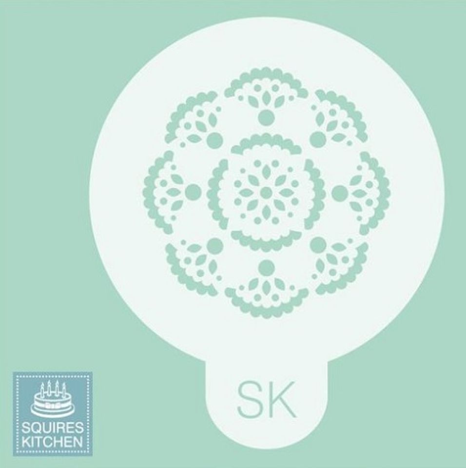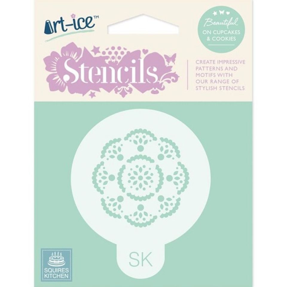 Cupcakes Deko Schablone "Rosace" in der Größe 6 cm. Die Deko-Schablone für Cupcakes und Kuchen ist rund und hat seitlich eine kleine Lasche zum Festhalten. Sie können die Schablone unkompliziert nutzen, um schöne Blütenmuster auf Ihre Cupcakes oder Ihren Kekse zu übertragen. Mit der Backschablone Rosace gelingen Ihnen schöne Rosetten auch auf Motivtorten.